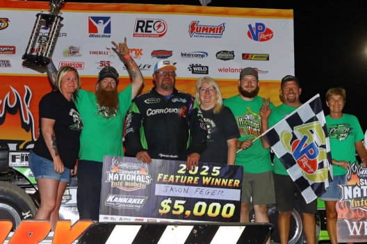 Second-starting Jason Feger of Bloomington, Ill., overcame a couple of mid-race restarts to lead all 30 laps en route to a dominant victory in Wednesday night's 30-lap DIRTcar Summer Nationals main event at Kankakee County Speedway. Feger beat Dillon McCowan to the checkers by 2.259 seconds for the $5,000 payday and his first Summer Nationals triumph since last July 18's season finale at Sycamore Speedway in Maple Park, Ill.