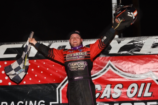 Bobby Pierce celebrates his debut victory at Shelby County Speedway.