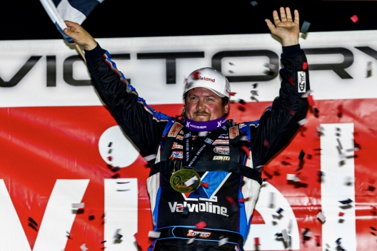 Second-starting Brandon Sheppard fired off from the outside pole and led all eight laps in winning the night’s first heat race by 1.199 seconds over polesitter Brandon Overton. Blair Nothdurft started and finished third while fifth-starting Dennis Erb Jr. grabbed fourth from Michael Leach on the second lap to clinch the fourth and final transfer spot into the 30-lap main event. … Clay Harris got the early jump on pole-starting Dallon Murty, leading all eight laps and winning the second heat by 0.819 over Murty. Brenden Smith held serve in finishing third while Cody Overton overcame contact on the race’s first two start attempts to complete the top-four finishers. The first caution flew on the opening lap when the younger Overton appeared to over-rotate at the entrance of turn one, collecting Smith and Max Blair, while sending Brody Smith spinning to avoid contact. Another stoppage came on the ensuing restart when Overton made contact with Ross Robinson, sending Robinson spinning in turn one and collecting Daniel Hilsabeck. Robinson continued to finish fifth, with Brody Smith in seventh; Blair and Hilsabeck retired after the early race contact. … Kyle Bronson fired off from the outside pole and secured a flag-to-flag victory in the third heat, crossing the line 1.596 seconds ahead of fast qualifier Garrett Alberson. Fourth-starting Carson Ferguson slipped by Drake Troutman on the opening lap, relegating Troutman to finish fourth. … Polesitter Hudson O’Neal used a turn-three slide job to pass Devin Moran on the second lap and paced the final seven circuits in winning the fourth and final heat race by 1.129 seconds over Moran, who led the opening lap. Daulton Wilson and Tyler Erb joined O’Neal and Moran in punching their ticket into the night’s $7,000-to-win non-points race.