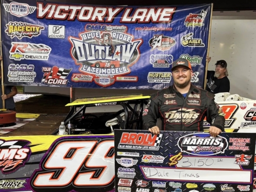 What won the race: Dale Timms of Hodges, S.C., strengthened his lead atop the Cagle Automotive Blue Ridge Outlaw Late Models standings with a flag-to-flag victory in Saturday’s Dedman Family Tribute at Harris Speedway. Timms finished 0.390 seconds ahead of Bryan Mullis for his second Blue Ridge victory this season.