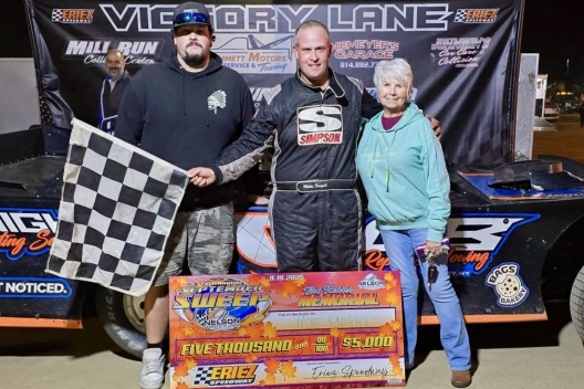 Key notes: Knight added to his September Sweep triumph on Sept. 15, 2023, also worth $5,000. ... He also topped a local Super Late Model field on June 1 for his other Eriez feature win this season. ... Tim McCreadie pursued Knight for all 35 laps, but couldn't draw any closer than seven-tenths of a second in the final stages. ... Teenager Brock Pinkerous took third from Boom Briggs on the final lap, relegating Briggs to fourth. ... Recent Eriez winners Max Blair and Greg Oakes each gained five spots to finish sixth and seventh, respectively. … Seven-time Eriez winner this season Dave Hess Jr. appeared to be eliminated along with Jared Miley and Andy Boozel as they battled for fifth, drawing the race’s lone caution on the sixth lap. They were credited with the last three spots in the final rundown. … The 35-lap main event lasted 13 minutes with 10 starters completing the distance and ended just before midnight local time. … Another $5,000-to-win feature is scheduled as part of Saturday’s September Sweep finale.
