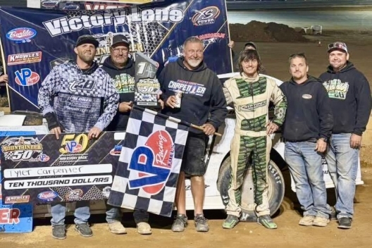 Winner's sponsors: Carpenter’s Kryptonite Race Car is powered by an Isner Race Engine and sponsored by Parkersburg Plumbing Supplies, Holdren Construction, Cordial Logistics, Overhead Doors, Stateline Construction, Burt Transmissions by Budda, Dirtcarlift.com, Dave Poske’s Performance Parts, Virginia Drivelines, Schaeffer’s Racing Oil, Integra Racing Shocks, Octane Race Products, Hoosier Tire Ohio Valley, Montgomery Motorsports and Graphic Creations.