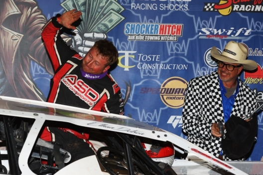 Ethan Dotson celebrates his $10,000 victory in Wednesday's Wild West Shootout feature.